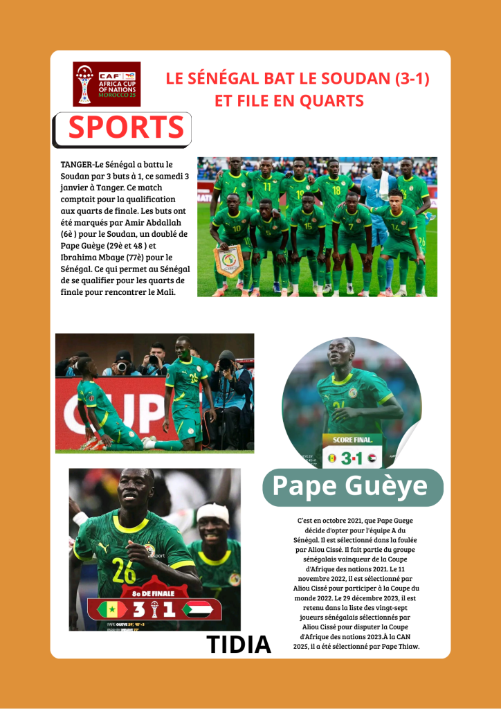 A LA UNE L'ACTU sportsCAN 2025:LE SÉNÉGAL BAT LE SOUDAN (3-1) ET FILE EN QUARTS par bocoum4 janvier 2026054 Partager0