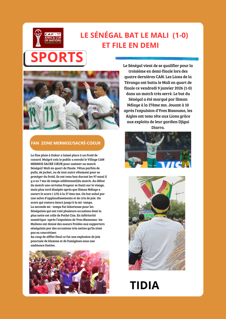 A LA UNE L'ACTU sportsCAN 2025: LE SÉNÉGAL BAT LE MALI ET FILE EN DEMI par bocoum14 janvier 2026034 Partager0